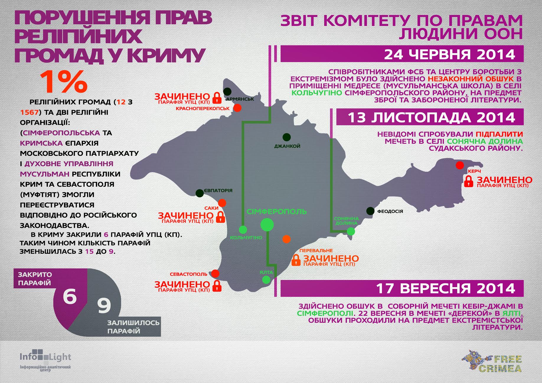 Виходячи з численних епізодів порушення прав релігійних громад у Криму, актуальності набуває створення реєстру утисків. Предствляємо Вашій увазі інтерактивну карту, яка відображає найбільш згадувані події у ЗМІ, що стосуються даної проблематики.